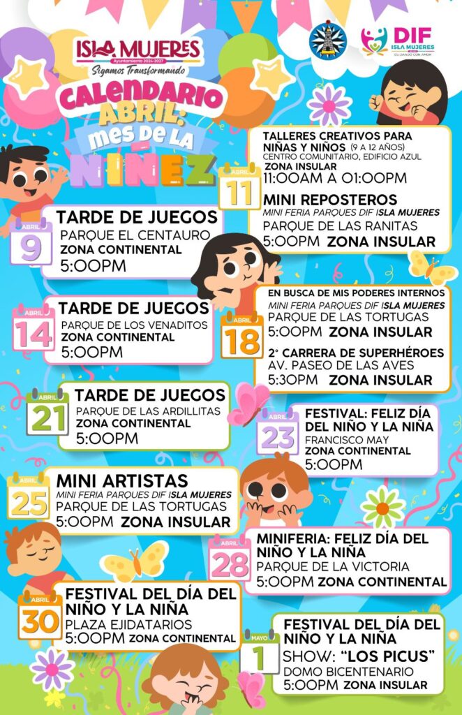 Las celebraciones continuarán el 23 de abril con el Festival del Día del Niño y la Niña en Francisco May a las 17:00 horas, y el 25 de abril con la actividad “Mini Artistas” en el Parque de Las Tortugas a las 17:00 horas.